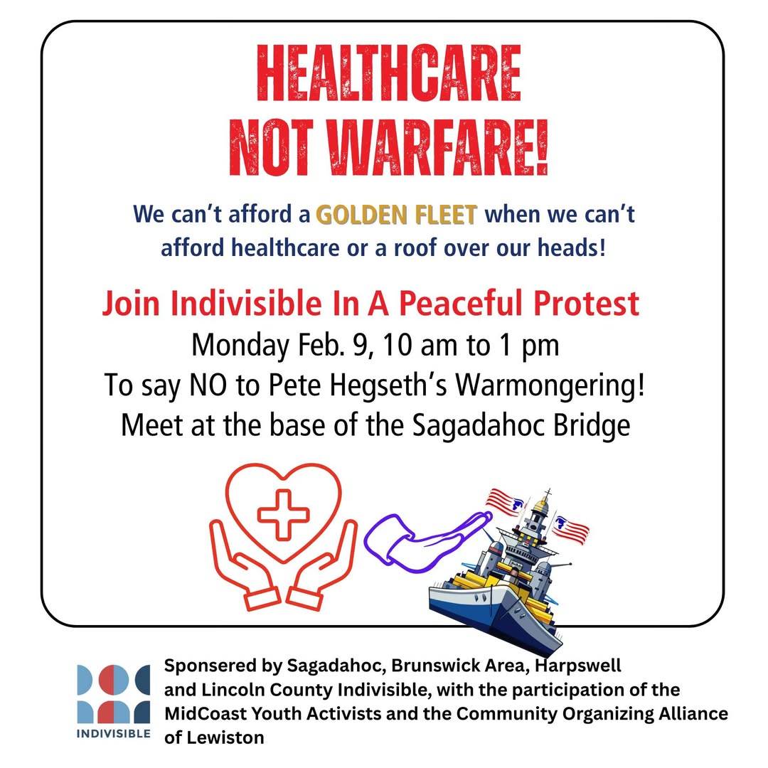 "We are a grassroots organization of concerned residents of Brunswick, Topsham and Harpswell” Newsletter for February 22, 2026 Brunswick Area Indivisible Action Calendar: Update -Time Change: Dr. Nirav Shah, Candidate for Governor. Wednesday, Feb. 25th from 6:30 to 7:30 pm. Brunswick United Methodist Church, 320 Church Rd, Brunswick. Postcarding - Wednesday, Feb. 25th starting at 4:00 pm. Brunswick United Methodist Church. BAI Monthly Meeting with guest speaker Shenna Bellows. Wednesday, March 11th, 6:30 pm. Brunswick United Methodist Church, 320 Church Rd, Brunswick. Democratic Gubernatorial Candidate Debate. Saturday, March 21st. 3:00pm. Orion Performing Arts Center, Update -Rescheduled:. BAI Book Discussion Group 'Autocracy Inc.' Monday, March 23rd, 4:00pm. Topsham Public Library Recurring Events (Brunswick) Tuesdays, 5:30 pm Brunswick Maine Street Route 1 Overpass Rally - Bring your signs and flags. Wednesdays, 12:30 pm Brunswick Town Mall Cosplay protest. Meet at the Gazebo- costumes optional Saturdays, 11:00 am to 12:00 - ICE OUT! Brunswick, Maine St. on Rt 1 Overpass. Bring banners, signs. Mark Your Calendar: March 28 No Kings III National Day of Action. More information to follow. For More actions and events, visit Activate Maine Urgent Action: Oppose the SAVE ActThe Senate is expected to vote on the SAVE Act the week of Feb. 23rd, after its weekend recess. Susan Collins provided the 50th vote needed to bring it to the Senate floor, where it faces strong opposition from Democrats. It is similar in some respects to Maine Ballot Question 1, which voters decisively defeated last November. The Bipartisan Policy Center reports the SAVE Act would impose unnecessary ID requirements on voters, add to the administrative burdens on our town offices and election officials as well as limit voting by mail. Chellie Pingree has called the SAVE Act a poll tax because of the cost of documents citizens, married women who take the surnames of their husbands in particular, would need to register or re-register to vote. For instance a current passport costs $130. The legislation is based on assertions of widespread voter fraud, definitively proven false for over a decade, wherever there has been an extensive investigation. Action: Don't delay: Call both Senators tell them to oppose the SAVE Act.Angus King, email contact form, office locations and phone numbers. Susan Collins, email contact form, office locations and phone numbers. Rally Report: Secretary Hegseth's Visit to BIW Feb. 9thA coalition of Indivisibles and other local resistance groups organized a 'Healthcare not Warfare' rally in response to Secretary of War Hegseth's 'Arsenal of Freedom Tour' stop at BIW. The rally was specifically defined as opposition to the administration's policies and spending priorities and not anti BIW. The Maine People's Alliance organized its own event separately. At its peak, an estimated 500 to 700 people stood on the sidewalks near the post office, stretching to the bridge, swamping the handful of pro-administration demonstrators. A number of people endured very cold conditions and stayed for hours. Inside, attendance was reported to be less than 1000, even though BIW workers were offered overtime pay to attend. For Registered Democrats:February 28th 9am-12pm. Topsham Democratic Caucus. Topsham Municipal Building, Don Russell Meeting Room 100 Main St. Register for this event with Mobilize. March 1st 2-4pm. Brunswick Regional Democratic Party Caucus. Brunswick Junior High 65 Columbia Ave. For the communities of Brunswick, Cumberland, Harpswell, North Yarmouth, and Yarmouth. Register for this event with Mobilize. The Maine Democratic Party Caucuses are gatherings of Democratic friends and neighbors from every town across Maine. Caucuses serve many purposes including selecting delegates to the MDP State Convention, electing local committee leaders, hearing from local legislators & candidates, nominating election clerks, and discussing local issues. Sign up here to receive updates & reminders through Mobilize. Voting 101: Semi-open PrimariesOn June 9, Maine will hold its primary election. Democratic and Republican nominees will vie for their party's choice for the Governor's race in November. The parties will choose who will run for Maine's House seats, and Democrats will choose their nominee to replace Sen. Collins. Some residents will vote for primary candidates in various district and municipal races. The semi-open primary means that voters who have not chosen a political party (Independents or Unenrolled Voters in Maine's terminology) may choose to vote in 1 of the party primaries. The Maine League of Women Voters has an excellent guide to the semi-open primary. It was written for the 2024 primary, but much of the information applies to the 2026 elections. The State of Maine provides a voting lookup service by town and street address, with polling place information. Candidates have until March 16th to collect the required number of signatures to appear on the ballot. Specific ballot information will be available after the signature approval process is complete. Sample ballots will be posted closer to the day of the primary. Actions:Make a plan to vote in the primary. The large numbers of competitors in many races makes this an extremely important primary. Contact your town clerk with questions, or call or text The League of Women Voters Maine hotline: (207) 558-3333. Put this number in your phone so you can share it with others. Talk up primary voting. Be sure your friends, family, coworkers, acquaintances know they can participate. Registered voters who wish to change their party enrollment must re-register at least 15 days before the election. For those who may not have voted recently, moved or changed names, Rock The Vote has a voter registration lookup service. Remember, voter registration and some associated information is public. How you vote is private. Check in with the State of Maine's Upcoming Elec